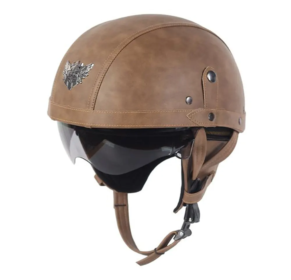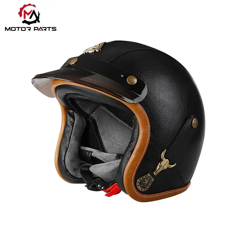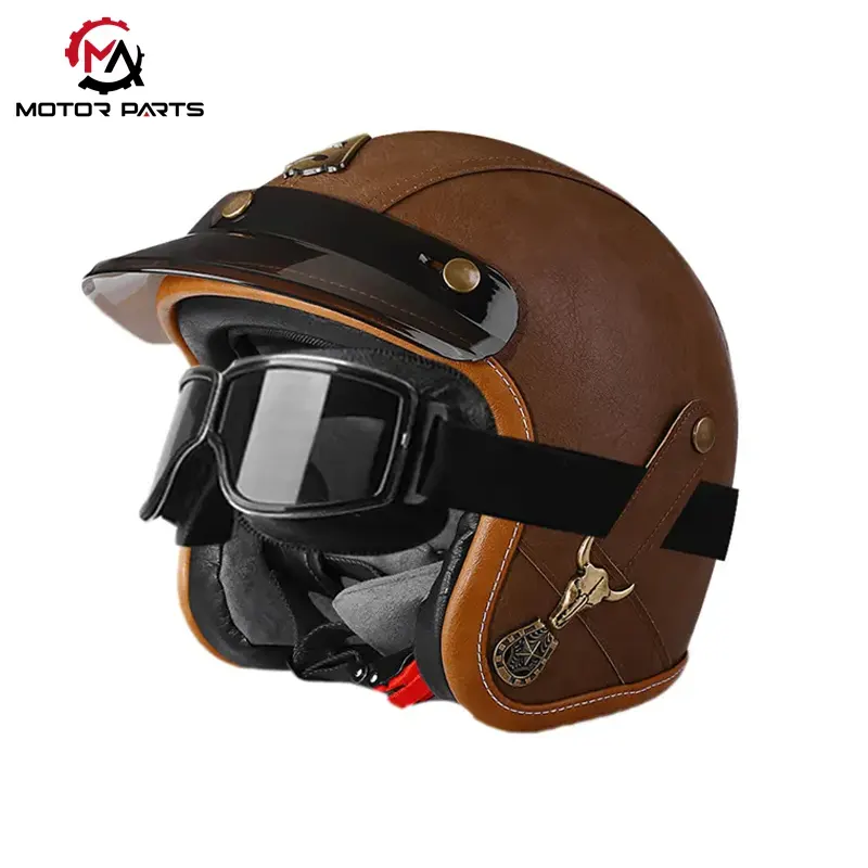 China Motorcycle Half Face Helmet Leather With Goggles ເປັນຜະລິດຕະພັນໝວກກັນກະທົບເຄິ່ງແບບ Retro ຈາກຜູ້ຜະລິດ Max Trading, ປະສົມປະສານການປ້ອງກັນຄວາມປອດໄພ ແລະການອອກແບບທີ່ທັນສະໄໝ, ເໝາະສຳລັບຜູ້ຂັບຂີ່ທີ່ໃຫ້ຄຸນຄ່າທັງຄວາມເປັນສ່ວນຕົວ ແລະ ການປະຕິບັດຕົວຈິງ.